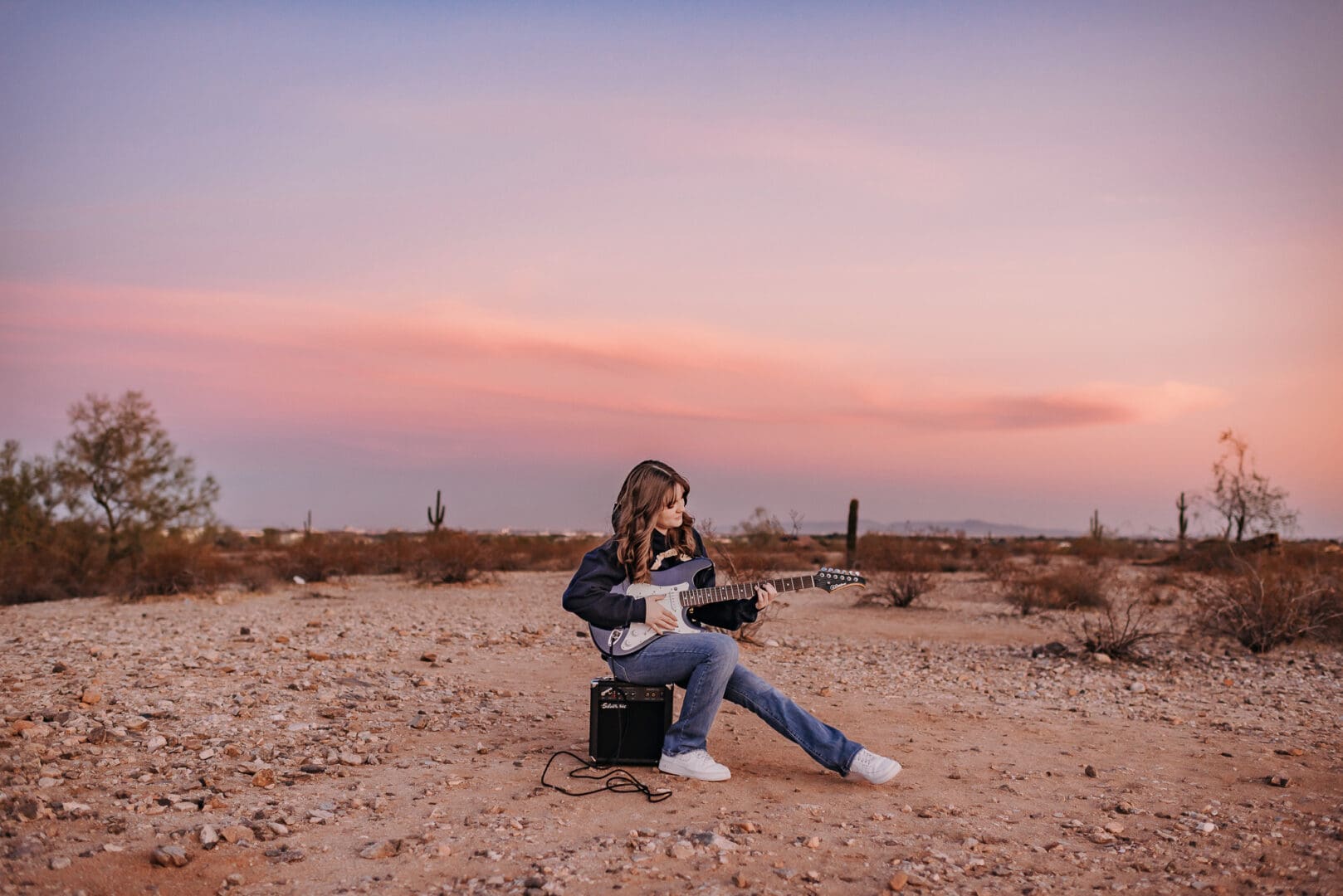 Meet Claire, a 2025 graduate from Paradise Honors High School in Surprise! I met up with Claire (and her mom, Shannon) for her senior session at Surprise City Hall for some urban photos, and then afterward we headed over for some desert photos at the White Tanks. I loved this session – Claire wore a few different outfits, and she even brought her electric guitar for some fun photos using it as a prop!