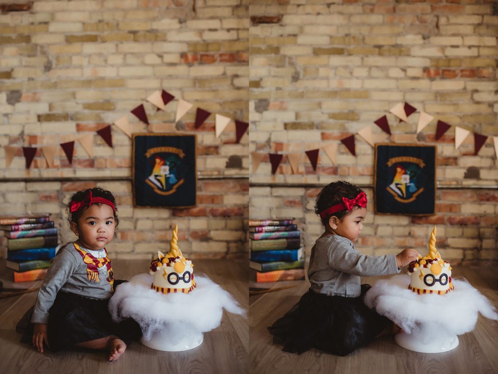 There might be nothing more adorable than a baby on their first birthday! I loved getting to hang out with Savannah for her first birthday cake smash session at my new photography studio in Burlington, even though she wanted absolutely nothing to do with smashing her cake! Savannah’s mom brought in a handful of goodies for her Harry Potter themed first birthday photo shoot! Complete with a Nimbus 2000, the full collection of Harry Potter novels and some Gryffindor-inspired gold and maroon flags!